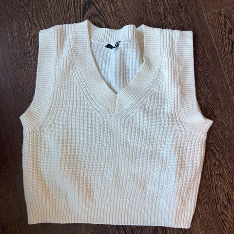 Erm løs, ribbestrikket modell i hvit farge med dyp V-utringning. Strikket i akrylmateriale. Passer godt alene eller over andre plagg som vest eller topp.