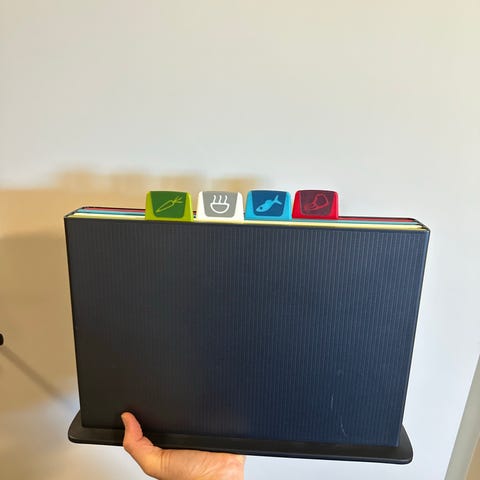 4 skjærefjøler av plast, praktisk organisert i en beholder. Ganske slitt, men de fungerer. Hver fjøl er ca 20 x 30 cm.