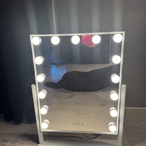 IKEA sminkebord med ovalt speil i hvit utførelse. Bordet har en glassplate på toppen og to små skuffer under speilet for oppbevaring av sminke eller småting. Passer til bruk på soverom eller garderobe som toalettbord eller sminkestasjon.