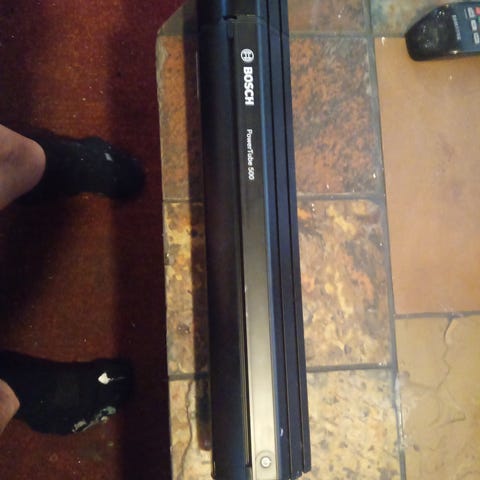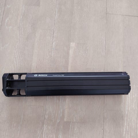 Bosch PowerTube 500 elsykkelbatteri. Dette er et horisontalt montert batteri som integreres i rammen på sykkelen.