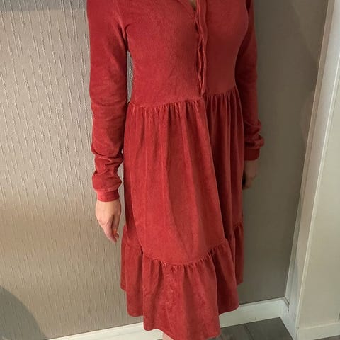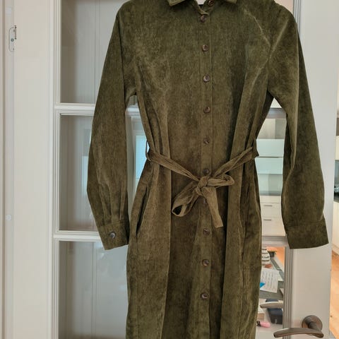 Moss Copenhagen hverdagskjole i cordfløyel. Kjolen er i størrelse XS og har en oransje farge. Den har lange ermer, krage og knepping hele veien ned foran. Det følger med knytebelte i samme stoff for justering i livet. Passer som hverdagskjole til dame.