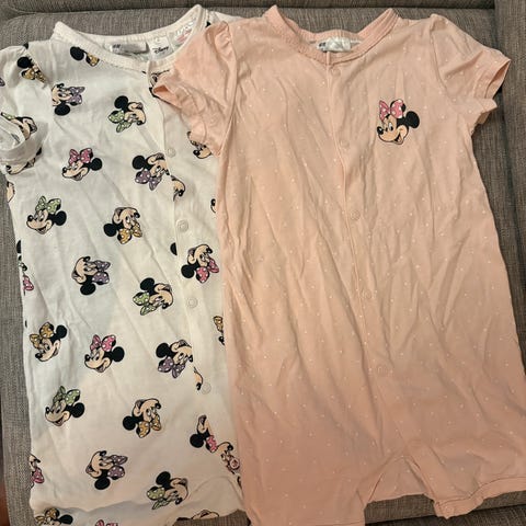 Dette er en rød Minni Mus-playsuit / pyjamas i str 80.