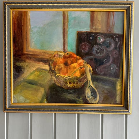 Gammelt vintage maleri selges. Motivet er et stilleben trolig utført i olje (eller akryl?) på lerret av ukjent kunstner. Lerretet er spent uten synlig ramme på bildene. Egner seg som veggdekorasjon for kjøkken eller spisestue. Mål: 55 cm bredt og 54,4 cm høyt. Må hentes på Lilleaker.