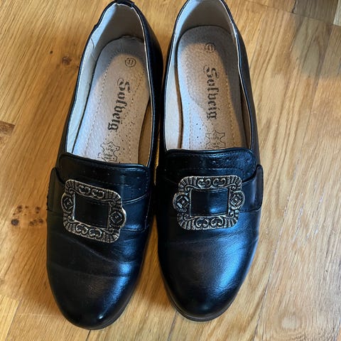 Som nye. Kjøpte disse rett før 17. mai i fjor. Tok de på på dagen, gikk hundre meter opp i gata og innså t de er for store. Str. 41, men romslige. Mulig de passer en 41,5, kanskje opp mot 42. Noen merker under fordi det er en veldig fin såle, men hatt på maks fem minutter. Komfortable og med skinn innersåle. Kjøpt på OBS for 599kr.