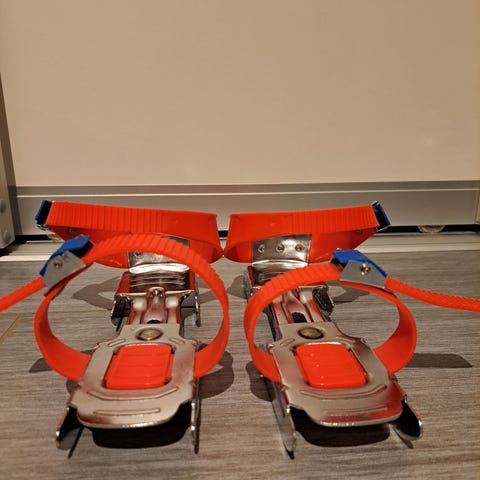 Barneskøyter for barn i størrelse 30. Justerbare skøyter som festes utenpå sko med plastreimer. Metallklinge under og rød plastreim over fot og hæl for å holde skoen på plass. Egnet til enkel skøytebruk på isbaner og lignende.