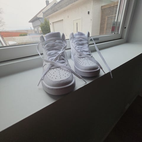 Nike Air Force 1 høye joggesko til jente i størrelse 36. Skoene er rosa med hvit såle og hvite Nike-logoer. Modellen har høyt skaft med borrelåsreim rundt ankelen for ekstra støtte, samt snøring foran for justerbar passform. Overdelen er i syntetisk materiale med perforeringer i tåpartiet for ventilasjon. Yttersålen er i gummi med klassisk Air Force 1-mønster for godt grep. Egnet som hverdagssko og fritidssko for barn.
