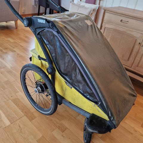 Thule sykkelvogn i blått med plass til to barn. Medfølgende joggekit og sykkelkit. Aldri brukt på saltede veier. Svært pent brukt, mest som pulk. Noen hull i myggnetting grunnet uforsiktighet med skistaver. Regntrekk følger med.
