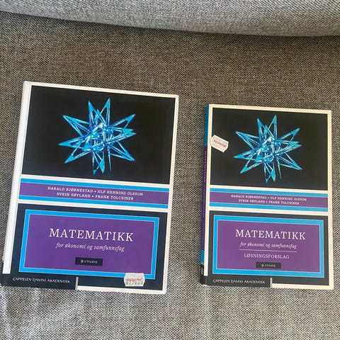 Matematikk for økonomi og samfunnsfag lærebok og tilhørende hefte med løsningsforslag. Bøkene dekker emner innen matematikk og statistikk tilpasset økonomi- og samfunnsfaglige studier, og inneholder teori, oppgaver og detaljerte løsningsforslag til utvalgte oppgaver.