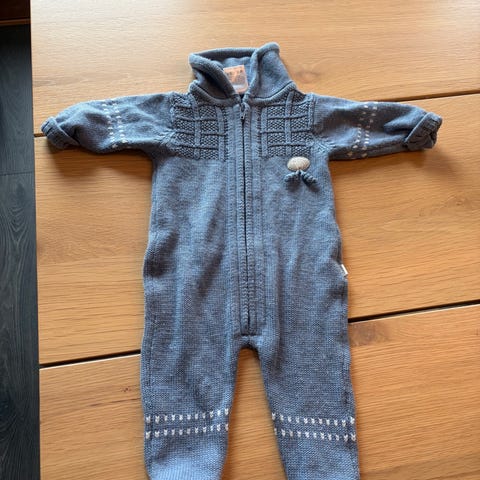 Pent brukt ulldress i str 62 og ulltøfler i str 68. To små skader hvor tråden har kommet ut eller er blitt litt dratt. Se bilder. Kan sikkert fikses av en litt mer kyndig syerske enn meg. Har ingenting å si for bruken ☺️.