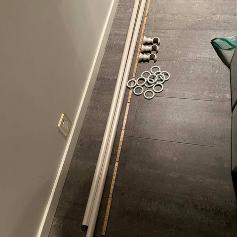 Spesiallaget gardinstang i eik med fester i gull. Har to stk. Lengde 126 cm.