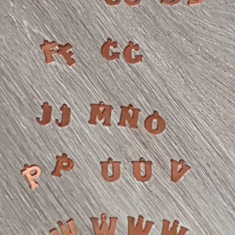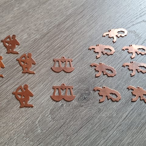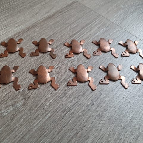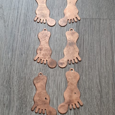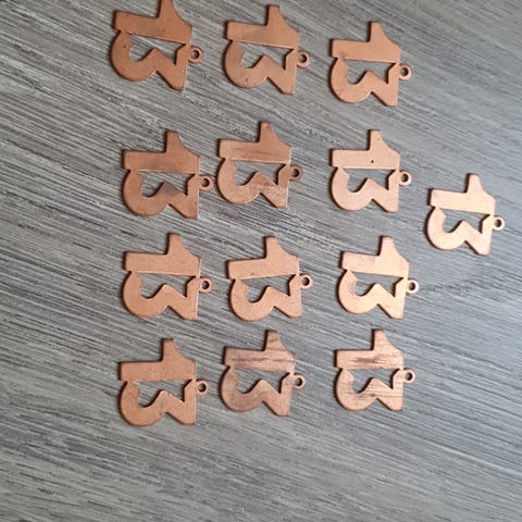 30 stk. smykkeanheng formet som tallet 13. Anhengene har en kobberfarget overflate. Usikker på om det er ekte kobber eller om det er et annet metall? Veier 66gr tilsammen. De er ubrukte, men sikkert 20 år gamle +-. De trenger sikkert litt puss og noen har mørke flekker.