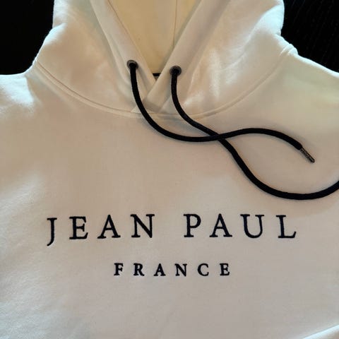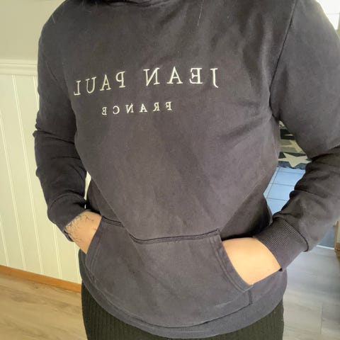 Jean Paul hettegenser for herre i størrelse L. Genseren er blå og laget av bomull. Den har hette med snøring, kengurulomme foran og ribbestrikkede mansjetter og linning. Logo trykket på brystet og lite merke på ermet. Passer til hverdagsbruk og fritid. Det første bilde er det som ligner best på fargen. Plagget er helt, men blitt noe falmet i fargen.