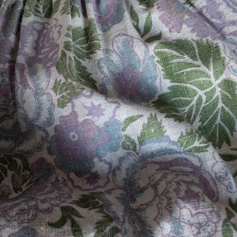 Lang damekjole i kremfarge med puffede ermer og markert liv. Kjolen har folder i overdelen og skjørtet, samt dekorativt belte i livet med blomsterapplikasjoner i pastellfarger. Nederst på skjørtet er det bred blonde- og broderikant rundt hele falden. Stoffet har lett glans som gir et høytidelig preg.