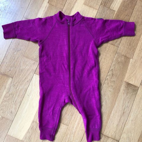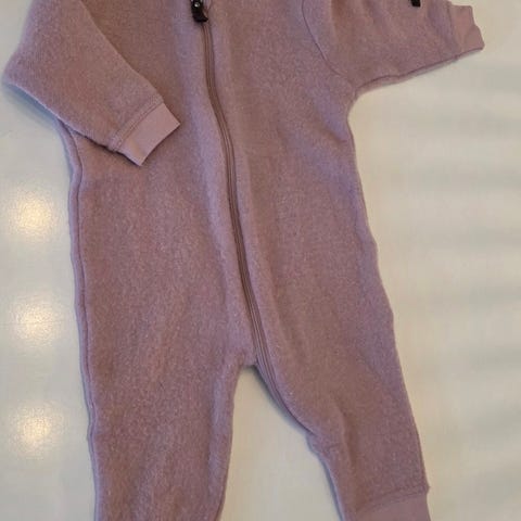 Ubrukt Hust & Claire ulldress for jente i størrelse 74. Heldress i rosa ull med brett på ermer og ben så man holde hender og føtter varme.