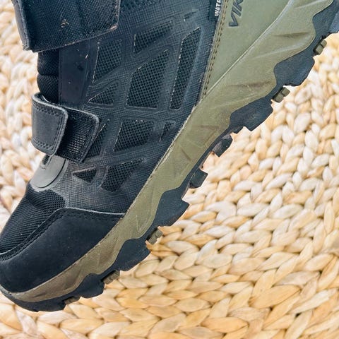 Viking joggesko til gutt i størrelse 38. Høymodell med snøring og borrelås over vristen for god passform. Skoene er hovedsakelig mørkeblå med gule detaljer og lys såle. Overdel i tekstil og syntetisk materiale, med polstret kant rundt ankelen for økt komfort. Yttersåle i gummi med mønster for bedre grep.