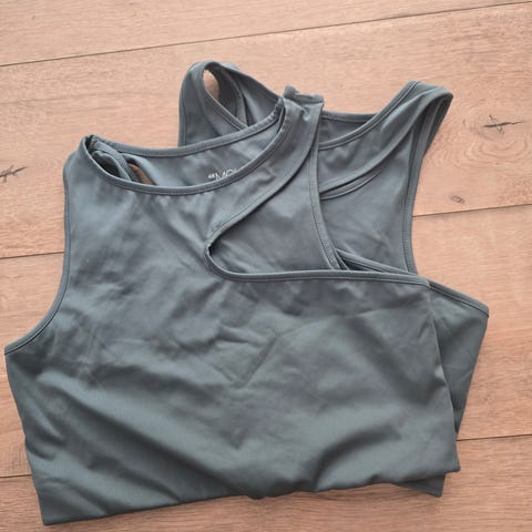 H&M Sport sports-bh for dame i størrelse L. Modellen er i hvit farge med lys kontrastkant og bryterrygg. Laget i et lett og pustende materiale som egner seg til trening og fitness. Elastisk strikk nederst gir støtte under aktivitet. Passer til ulike treningsformer som styrke, kondisjon og annen fitnesstrening.