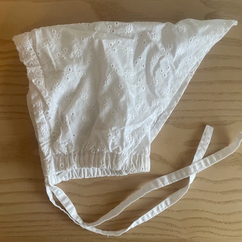 Lue / hodeplagg, med blonder og knyting.