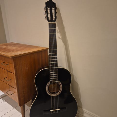 Akustisk gitar i naturfarget treverk. Klassisk kroppsform med nylonstrenger, gripebrett med båndmarkeringer og standard stemmeskruer på hodet. Passer til generell øving og spilling hjemme eller på øvingsrom. Egnet for nybegynnere og viderekomne som ønsker en enkel akustisk gitar til akkompagnement og melodispill.