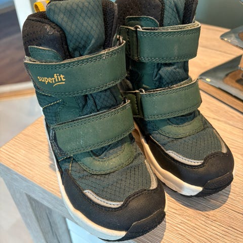 Superfit barnesko i størrelse 28 for unisex. Skoene har overdel i grønn tekstil og syntetisk materiale med svarte detaljer, hvit mellomsåle og yttersåle med gule partier. De har to borrelåsstropper for enkel justering og av- og påkledning. Modellen er egnet som hverdagssko eller fritidssko for barn.