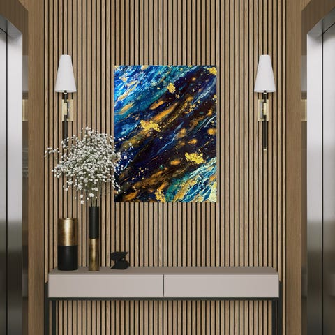 Abstrakt maleri på lerret i rektangulært format. Motiv med brede penselstrøk i hovedsakelig blå, gule, grønne og brune toner. Maleriet er inspirert av himmelbildet.