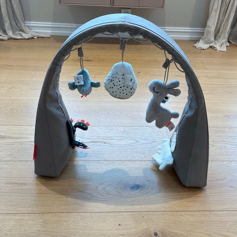 Babygymmen er pent brukt. Men noen bruksmerker kan forekomme. Lekene som henger på, kan tas av for vask i maskin, på inntil 40 grader.