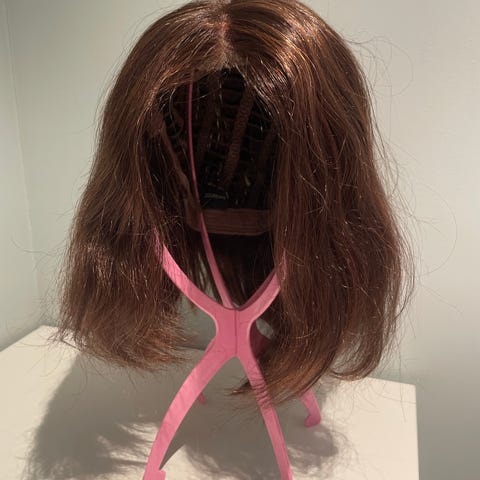 Den er laget av ekte hår, som er ca. 40 cm på det lengste. Oppklippet frisyre med en liten lugg på siden.