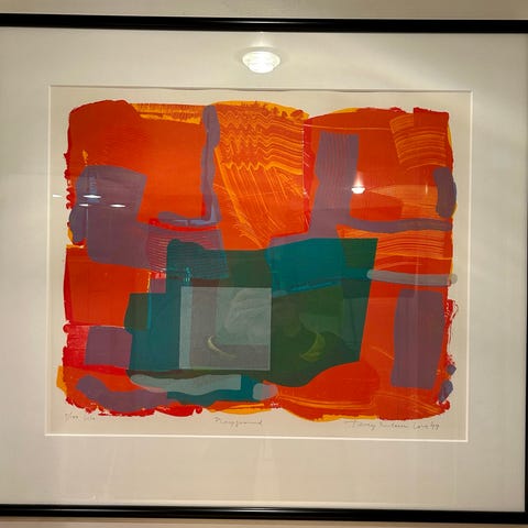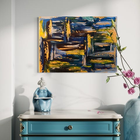 Abstrakt maleri på lerret i størrelsen ca. 50 x 50 cm. Motiv i hovedsak i blåtoner med innslag av gule, oransje og røde felt og strøk. Maleriet er kvadratisk og montert på blindramme, klart til oppheng.