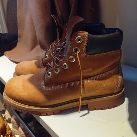 Timberland boots. Svarte boots med hvit polstret kant og kraftig yttersåle med grovt mønster. Snøring foran med metallhemper. Egnet som hverdagssko eller til utebruk i kjøligere vær. Materiale fremstår som robust og slitesterkt, med profilert såle for godt grep.