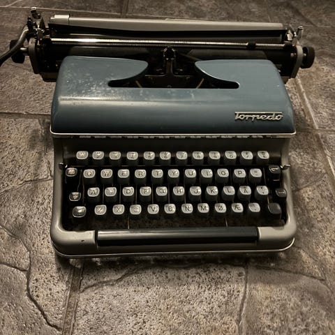 En gammel manuell skrivemaskin med oppbevaringsboks. Oppbevaringsboksen er ikke så fin, men skrivemaskinen virker grei bortsett fra noe ubetydelig rust på oppsiden.