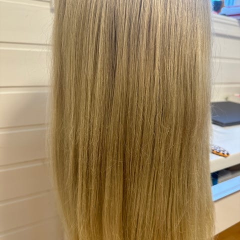 Parykk laget med en blanding av ekte og syntetisk hår i blond farge med mørkere striper.