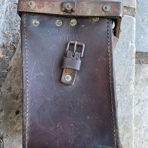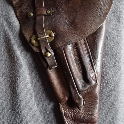 Tysk saltaske i brunt lær. Noe svak stempling, men jeg mener å kunne tyde at den er produsert i 1941. Godt brukt.