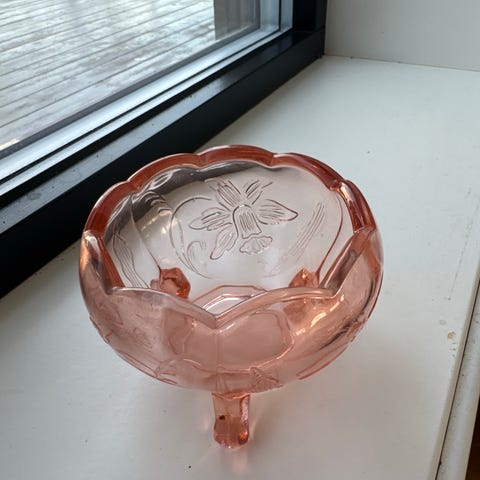 Dekorativ glasskål med presset blomstermønster i klart glass. Fin som serveringsskål til godteri, nøtter eller småkaker, eller som pynt på bord eller kommode. Klassisk og tidløs stil.