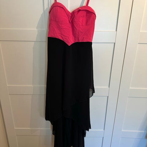 Stilig Guess festkjole for dame i størrelse M. Kjolen er stroppeløs med ferskenfarget overdel med stretch og glidelås, samt gummi fremme for feste. Sort, asymmetrisk skjørtedel, ca ankellang med lett, transparent ytterstoff og fôret underskjørt.