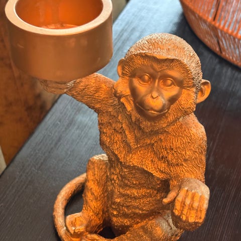 Telysholder i form av en sittende apefigur. Lysestaken er svart og har en rund holder på toppen av apeens løftede arm, egnet for standard telys. Apen har en hvit flekk på ryggen. Dette har aldri plaget meg, men kan eventuelt sprayes over med sort spraylakk. Mål: ca 15,5 cm.