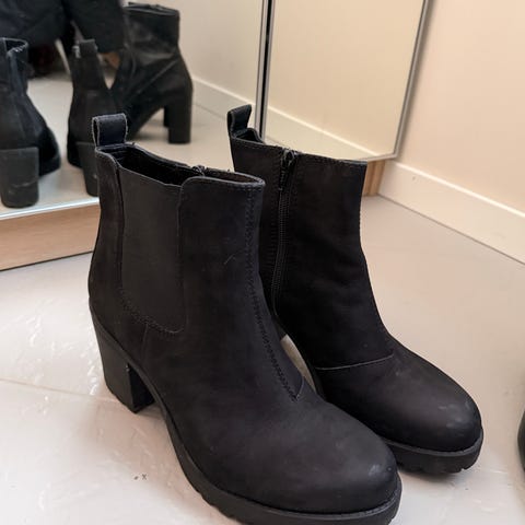 Roots ankelstøvletter i størrelse 39. Skoene er svarte med grov såle og blokkhæl. Modellen har glidelås på innsiden av skaftet for enkel av- og påtaking. Overdelen fremstår i et semsket eller nubuck-lignende materiale, og innsiden har tekstilfôr. Egnet som hverdagsstøvletter i kjøligere vær.