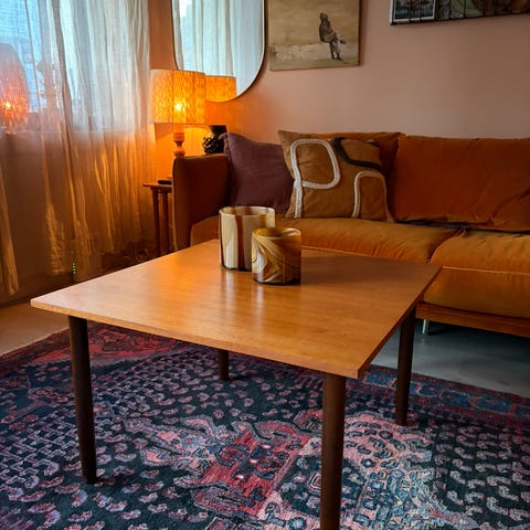 Kan brukes som smalt sofabord eller som sidebord. Bordplaten er i teakfinèr og understell er i heltre. Lett og plasseringsvennlig. Liten chip på bordplaten, se siste bildet. Ellers er bordet stødig, har få bruksspor, og er i fin vintage stand.