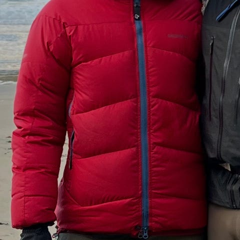 Norrøna trollveggen dunjakke god og varm selges. Noen år gammel,men fremstår pent brukt. Er blå i fargen og med rosa innside.