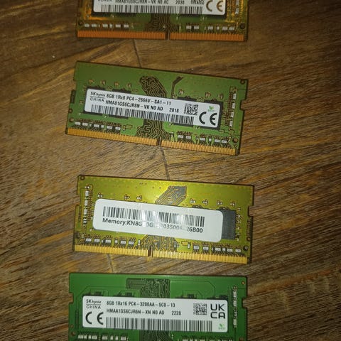 Selger 2 stk fungerende minnebrikker (RAM) til bærbar PC. Brikkene er av merket SK Hynix og er på 8GB hver, som gir totalt 16GB oppgradering.