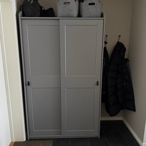Dører og front til skyvedørsgardeobe. 3 dører hver på 113cm. Høyde ca 238 cm, bredde 333 cm. Skinner oppe og nede følger med. Ingen synlige merker og i topp stand. Bredde og høyde kan jo tilpasses rommet til en viss grad.