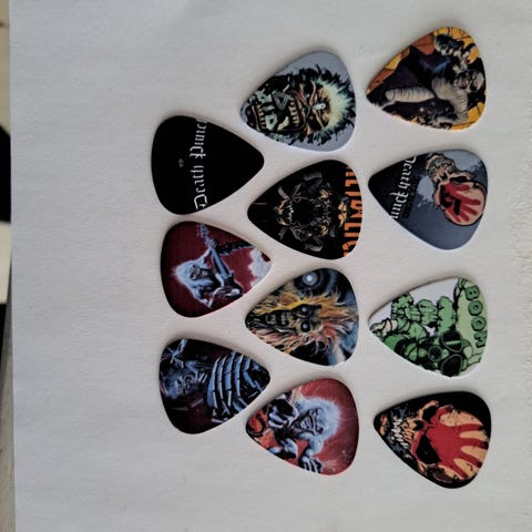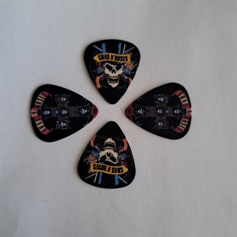 4 tykke plektre til gitar med hodeskalle-motiv.