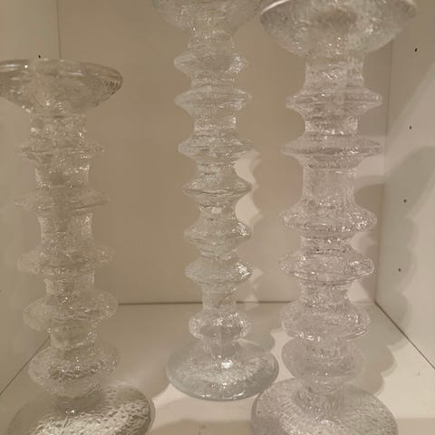 Flott sett med Festivo lysestaker i klart glass, designet av Tapio Wirkkala for Iittala. Settet består av tre lysestaker, wn med 5 ringer og to med 3 ringer. De er laget for å stå sammen og skape et vakkert lysspill.