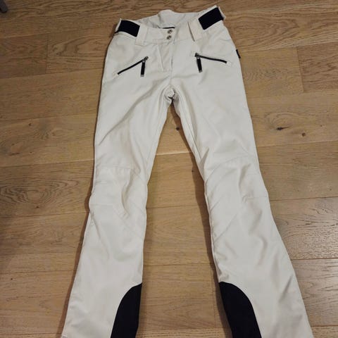 Jotunheim skibukse for dame i størrelse S. Buksen er i hovedsak hvit med svarte paneler langs sidene og forsterkninger nederst på bena. Den har beltehemper i livet, knappelukking og glidelås foran. Flere glidelåslommer foran gir plass til småting. Nederst på bena er det glidelås og snølås for å sitte godt over støvler. Egner seg til bruk i skibakken og annen vinteraktivitet.