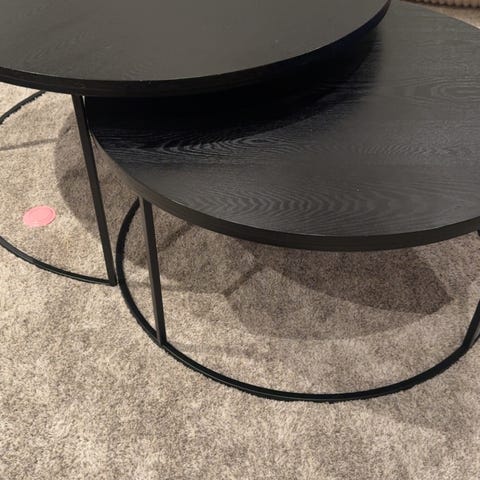 Rundt sofabordsett Ø90 H 45,5 og Ø75 H 35 cm i svart lakkert askefinèr og sotet glass med stål understell