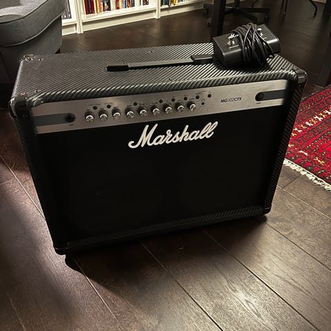 Marshall MG 50 FX gitarforsterker med 50 watts effekt. Forsterkeren har flere kanaler og innebygde effekter, samt kontroller for blant annet volum, gain, bass, mellomtone og diskant. Kabinettet er i svart utførelse .