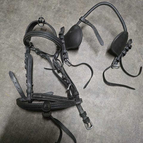 Komplett kjørehodelag i lær m/skylapper og brune gummitømmer følger med.