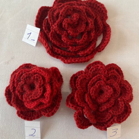 Håndlaget heklede pris er 49 kr stk. blomsterbrosjer i flerfarget garn. Brosjene er formet som lagdelte blomster med ulike fargekombinasjoner. De kan brukes som tilbehør på jakker, gensere, vesker, luer eller skjerf. Hver brosje er individuelt nummerert på bildet for å vise de forskjellige variantene. Materialet ser ut til å være akryl- eller ullgarn. Egnet for både voksne og barn, avhengig av ønsket bruk og stil.