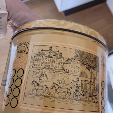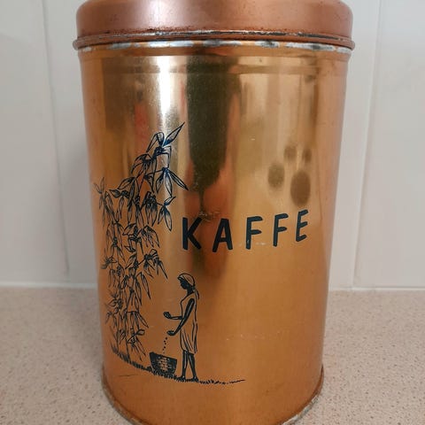 Boks med kaffemotiv, fin til oppbevaring av kaffe f eks. Det er det den har vært brukt til her, så sitter litt kaffelukt i den, ellers hel og pen uten skader.