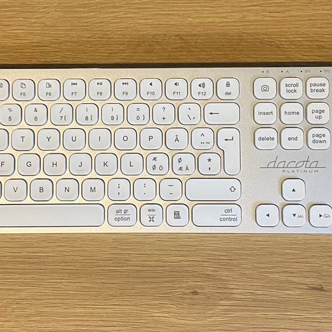 Apple Magic Mouse i god stand, synes den er litt treg i bevegelse. Trådløs mus med Bluetooth og batteridrift. Fungerer som den skal og kobles enkelt til Mac.