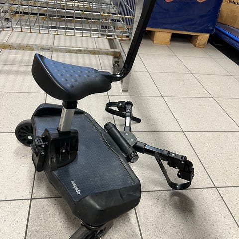 Bumprider Ståbrett med Sete er et universellt ståbrett laget for å passe alle barnevogner. Nå kan storesøsken både sitte og eller stå på trilleturen.