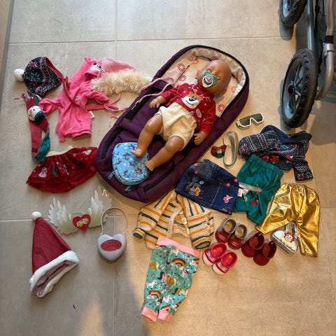 Baby Born dukke med klesstativ og strikkede klær. Settet inneholder en dukke og flere plagg i ulike farger, blant annet kjole, genser og små tilbehør som passer til dukken. Klærne er strikket i garn og har forskjellige mønstre og fargekombinasjoner. Egnet til lek og påkledning av Baby Born-dukke i standard størrelse.